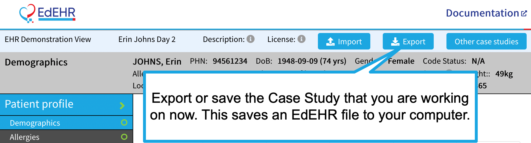 If you want to save the case study you see then use the export button. This will save the case study in a json file on your computer. You can share this file with friends via email or import it into your main instance of EdEHR later.